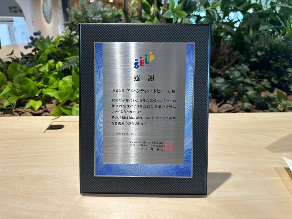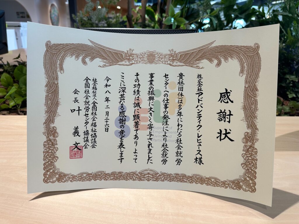 アドバンティク・レヒュースが全国社会就労センター協議会より、感謝状を頂きました