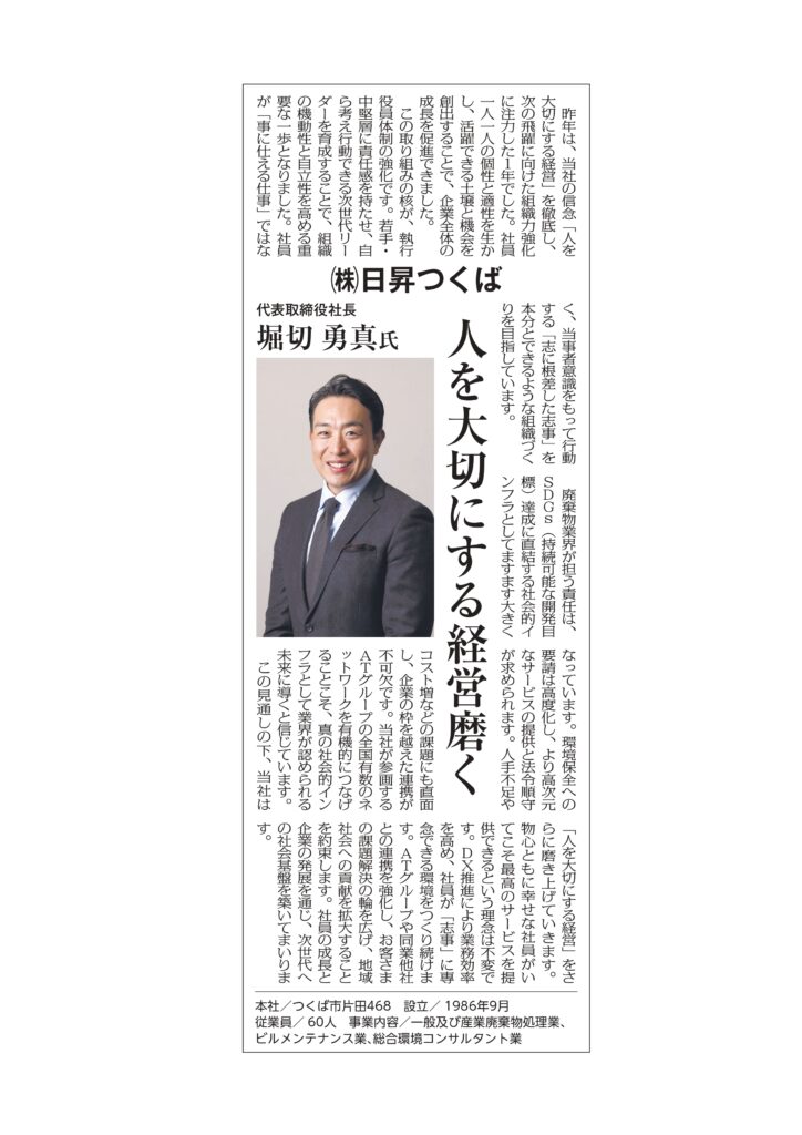 弊社代表堀切が、1月8日発刊の茨城新聞新年特集「トップが語る2026」にて、人を大切にした経営についての紹介記事に掲載されました。