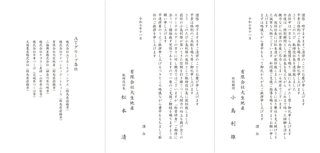 有限会社大生地産の取締役社長ならびに特別顧問を下記の通り決議いたしましたのでお知らせいたします。